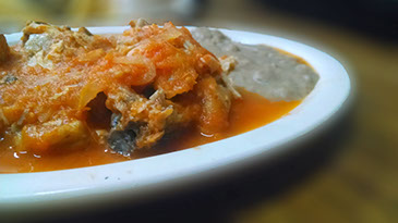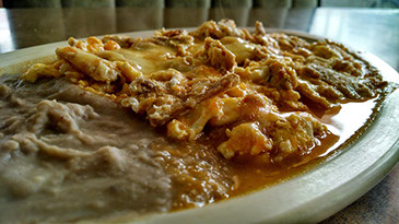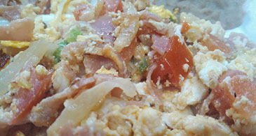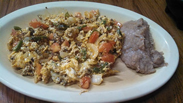 Huevo, cebolla, tomate y chile cortado, acompañados de frijoles.